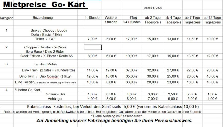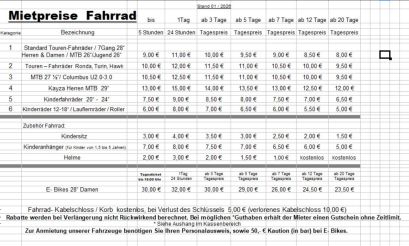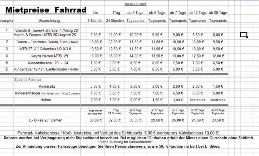 Falls Sie E-Bikes mieten möchten, planen Sie bitte auch 50,- € Kaution pro E-Bike mit ein.